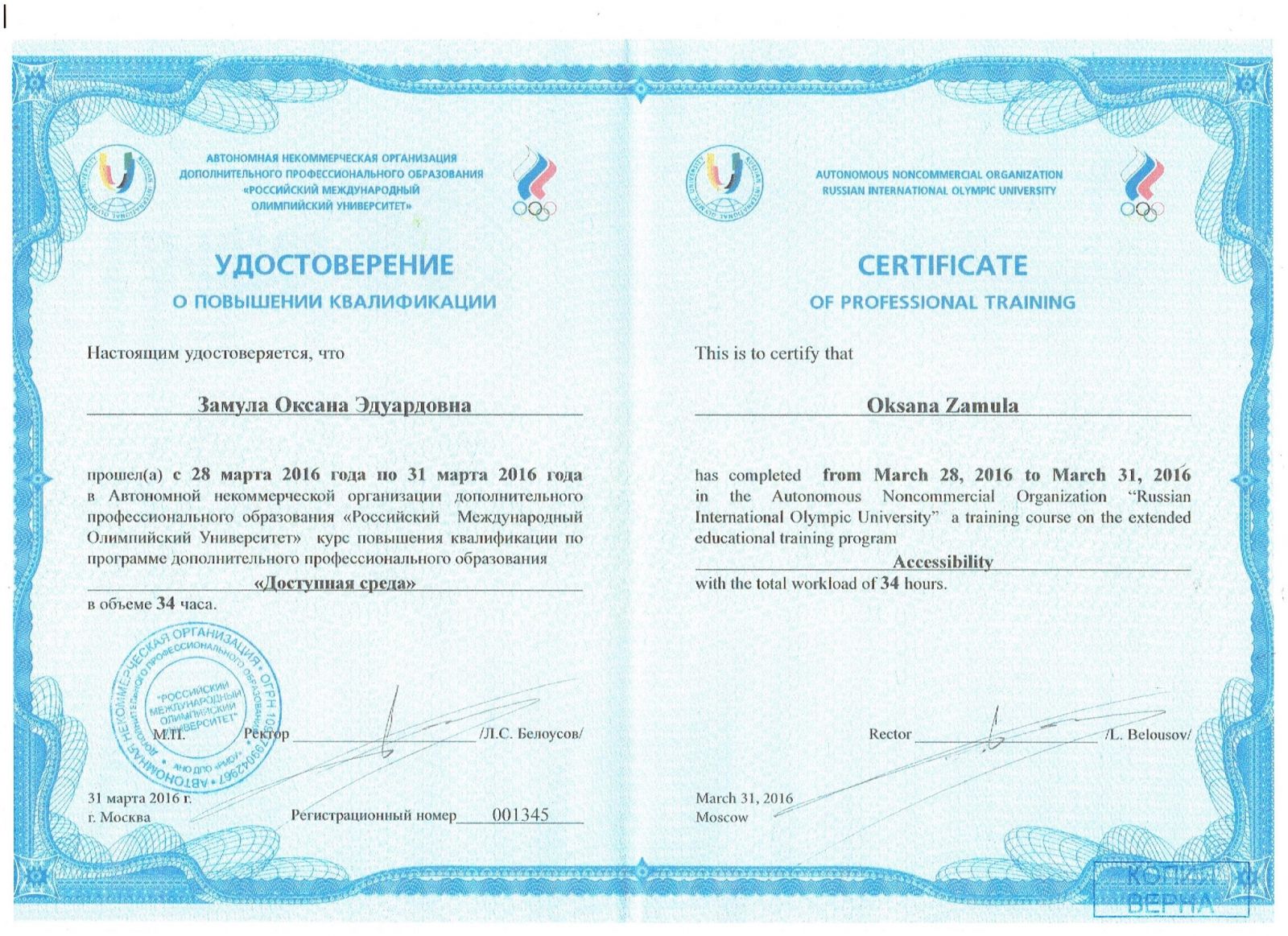Специалист по доступной среде АНО ДПО «Российский Международный Олимпийский Университет»;